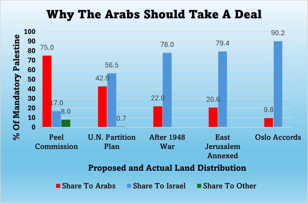 For Many (about 1,400) years there has been a dispute as to how to divide Mandatory Palestine between the Arabs and The Jews. We at The Meaning of Life are no experts but a glance at the chart below shows that the Arabs should make a deal fast because each new deal offered provides them with less and less land.